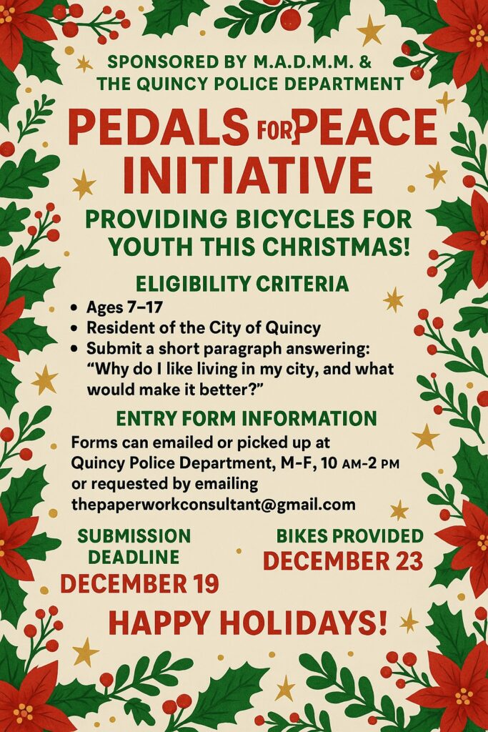 The Quincy Police Department, in partnership with M.A.D.M.M., is proud to announce the launch of the Pedals for Peace Initiative, ...