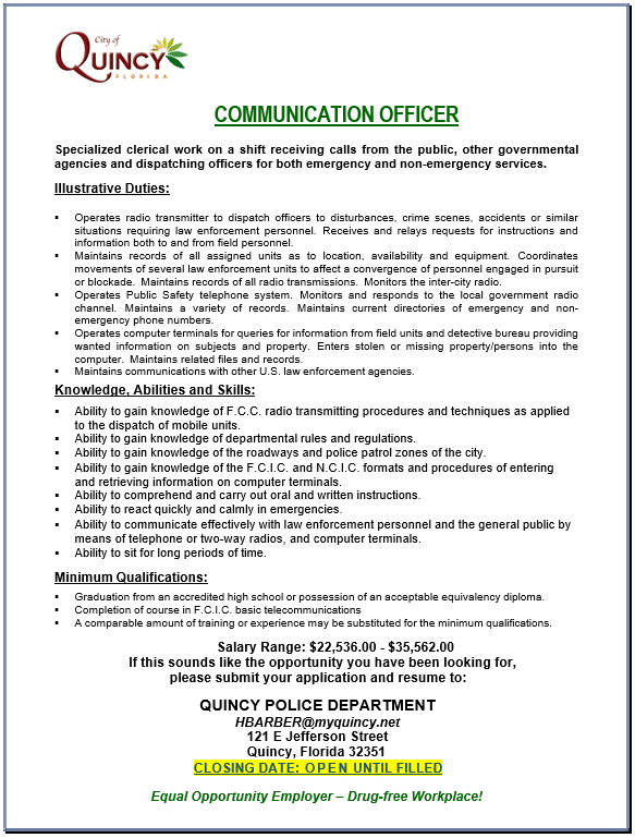 Employment opportunity with the City of Quincy. The Quincy Police Department is currently seeking communications officers. Please see below job ...