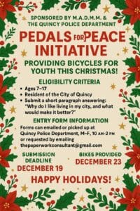The Quincy Police Department, in partnership with M.A.D.M.M., is proud to announce the launch of the Pedals for Peace Initiative, a holiday community program designed to provide bicycles to youth in the City of Quincy this Christmas season while encouraging positive engagement and civic pride among young residents.